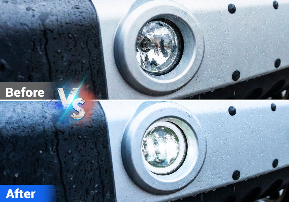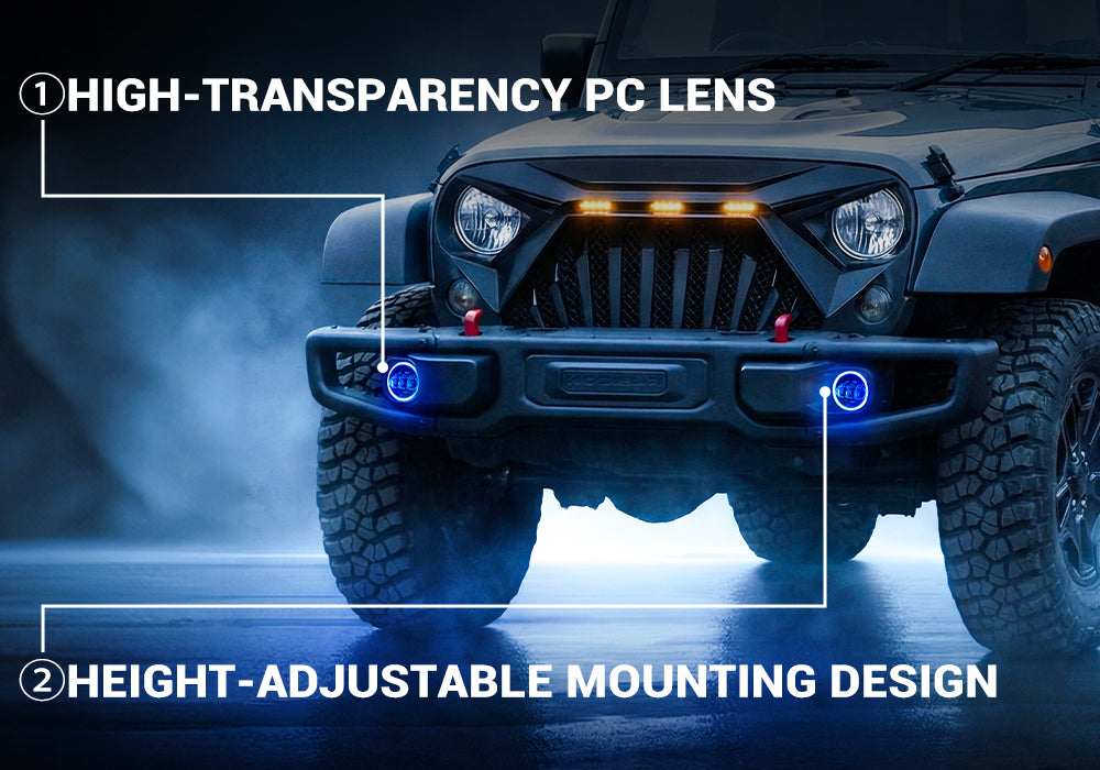 This 4-inch LED fog light is designed for Jeep JK/JL/JT, featuring premium CREE chips and aircraft-grade aluminum for stable, reliable 2400LM bright white illumination. Its unique RGBW halo allows multicolor, personalized lighting, with brightness and color fully adjustable via Bluetooth. Compared to traditional halogen lights, it delivers higher performance, longer lifespan (30,000+ hours), and energy-efficient operation. With all-weather protection and plug-and-play installation, this upgrade ensures safety, style, and convenience — perfect for off-road adventures or daily driving.