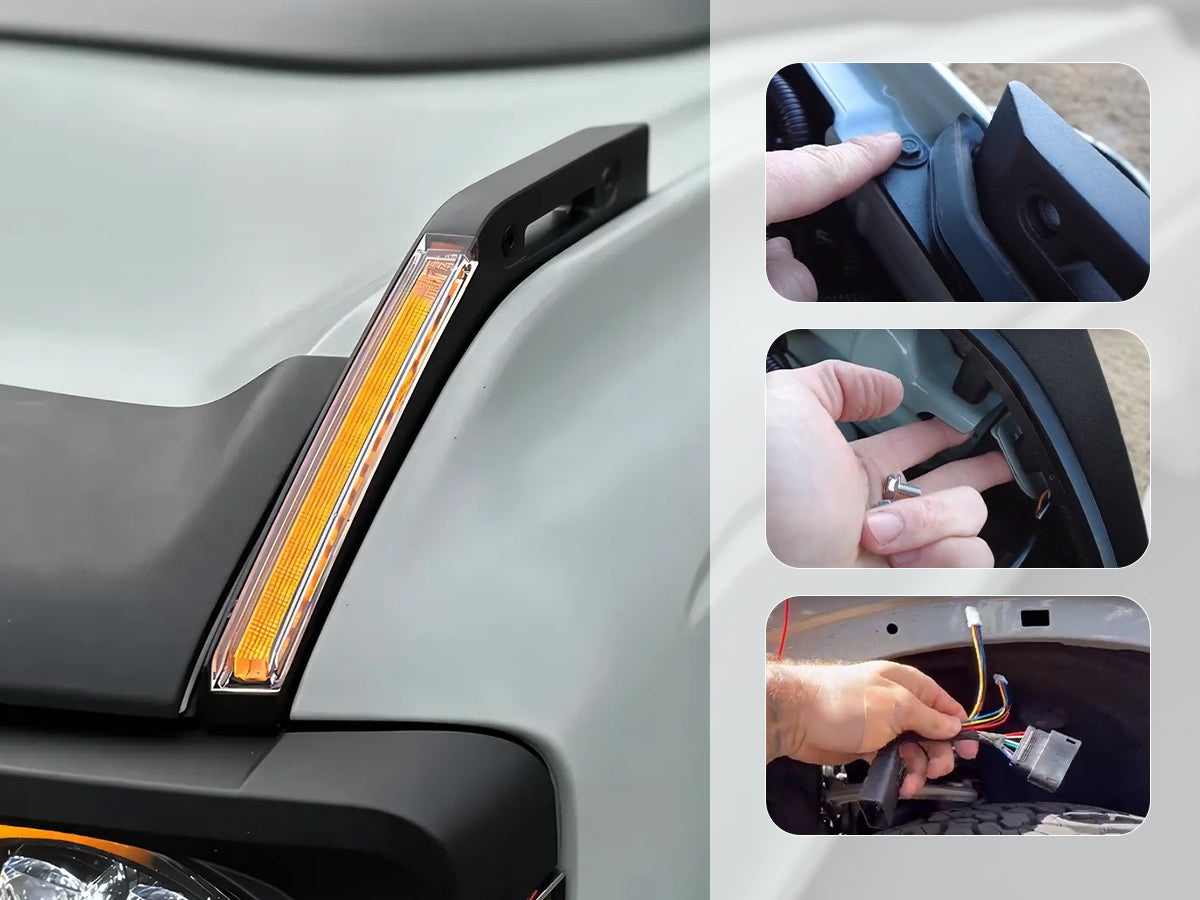 Las direccionales LED secuenciales integradas ofrecen una iluminación ámbar suave y fluida para máxima visibilidad. Al girar, las luces cambian al color DRL seleccionado.