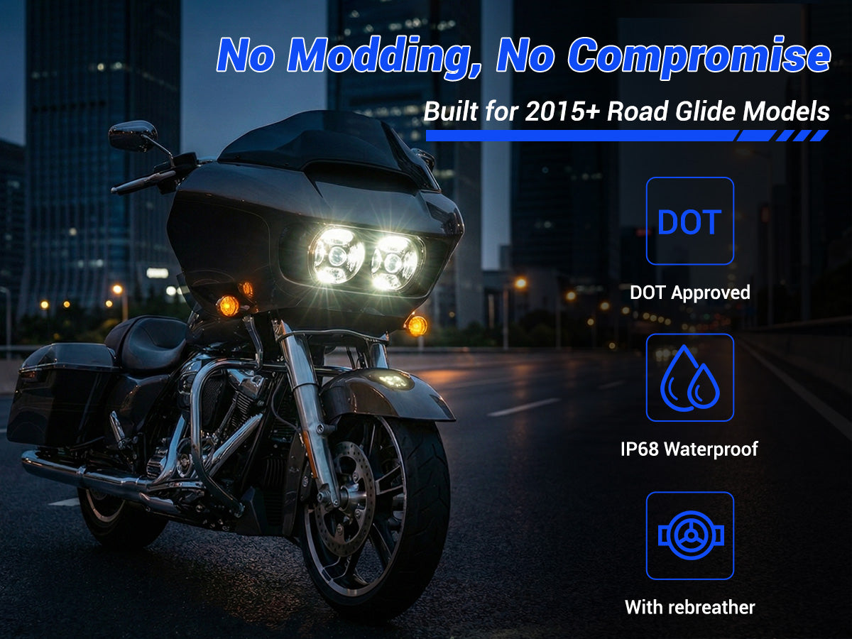 These LED dual headlights are designed to be a direct plug and play retrofit for the 2015-2024 Road Glide models. Just Plug N Play without any modification and parts. Perfectly match with original mounting screws. One year warranty!