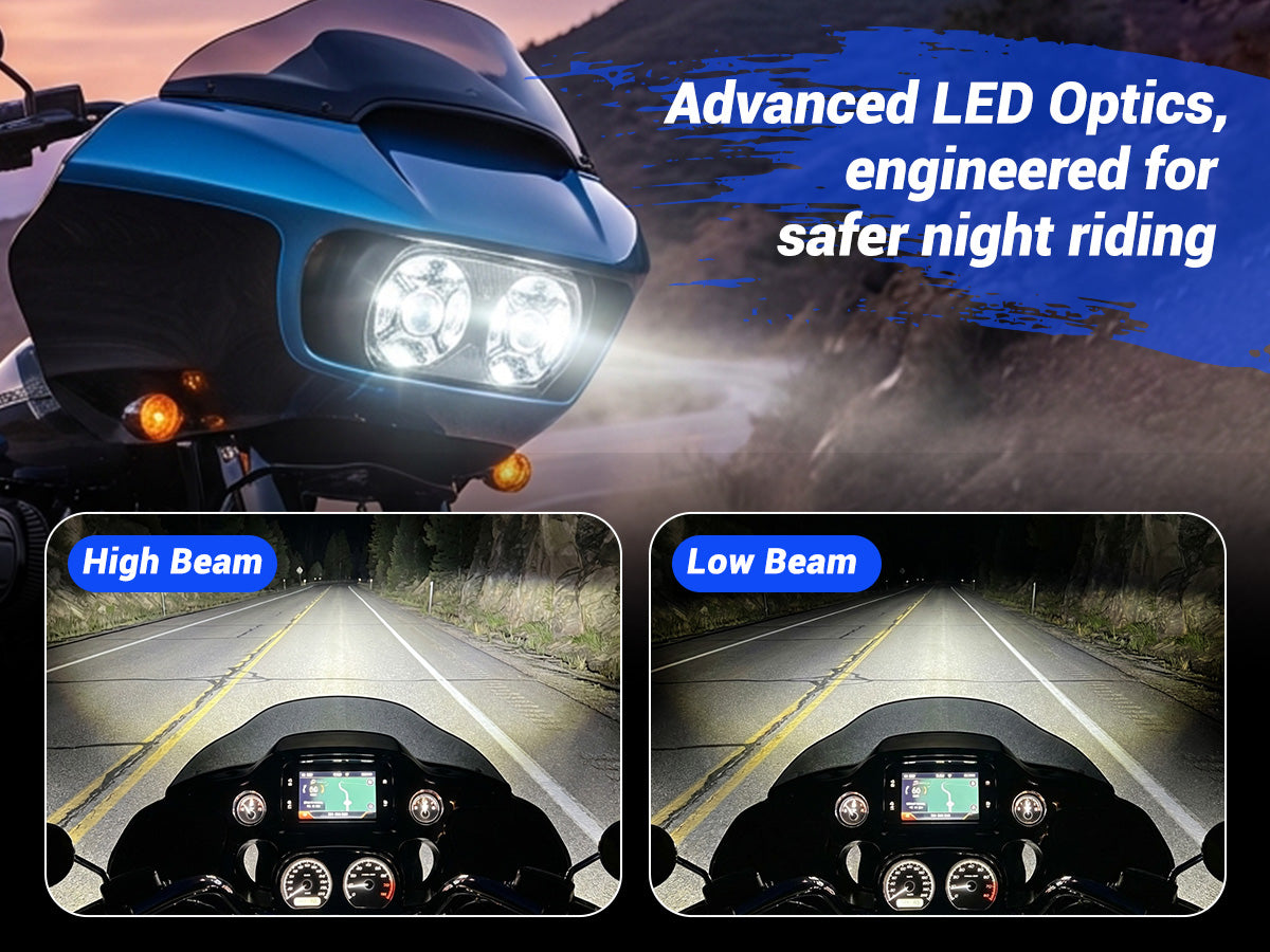 A sharp, focused beam delivers powerful high beams and glare-free low beams for safer night riding.
