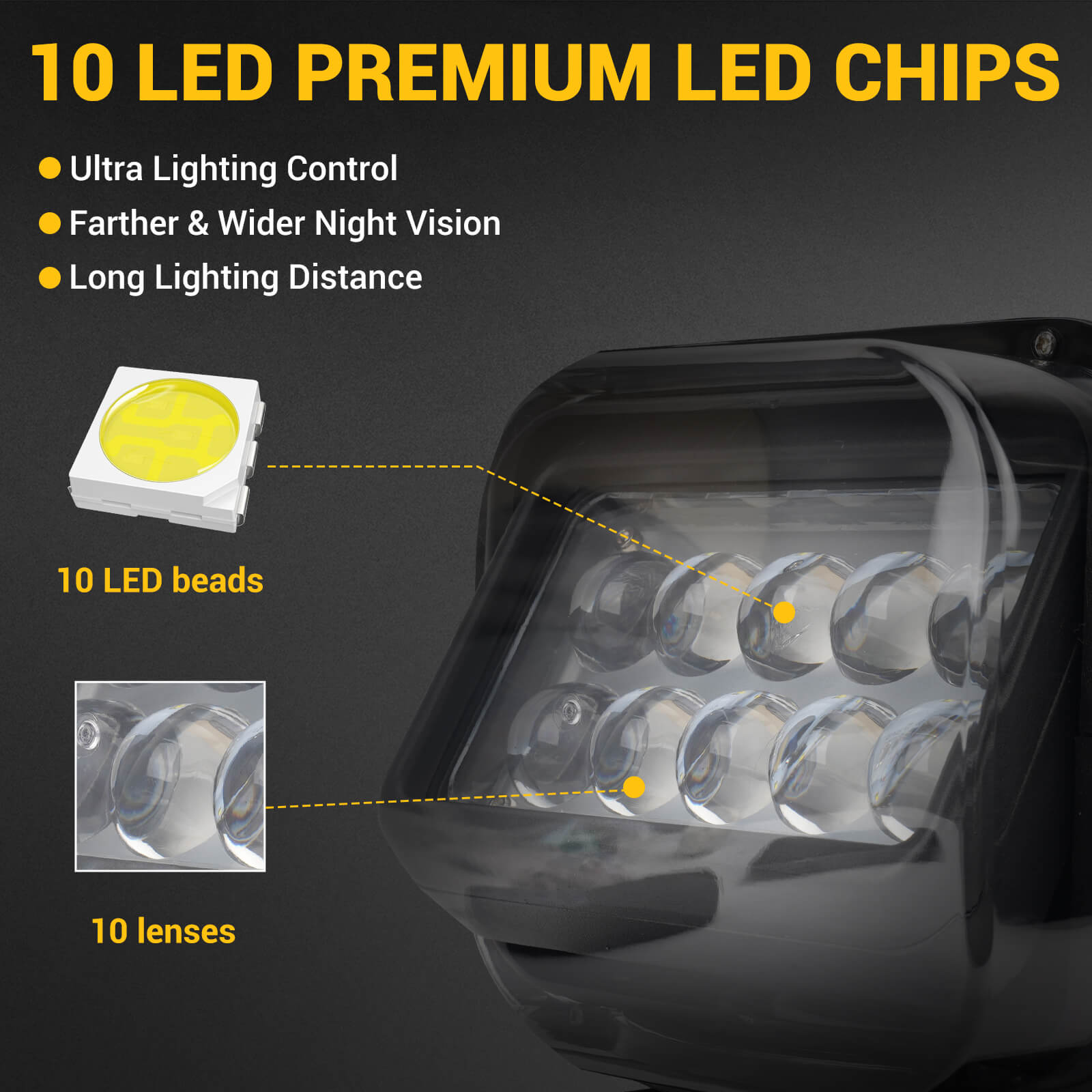 Equipped with 10 premium LED chips and lenses, delivering far-reaching, wide-angle illumination. Ultra lighting control optimizes beam focus for enhanced night vision and long-distance performance.
