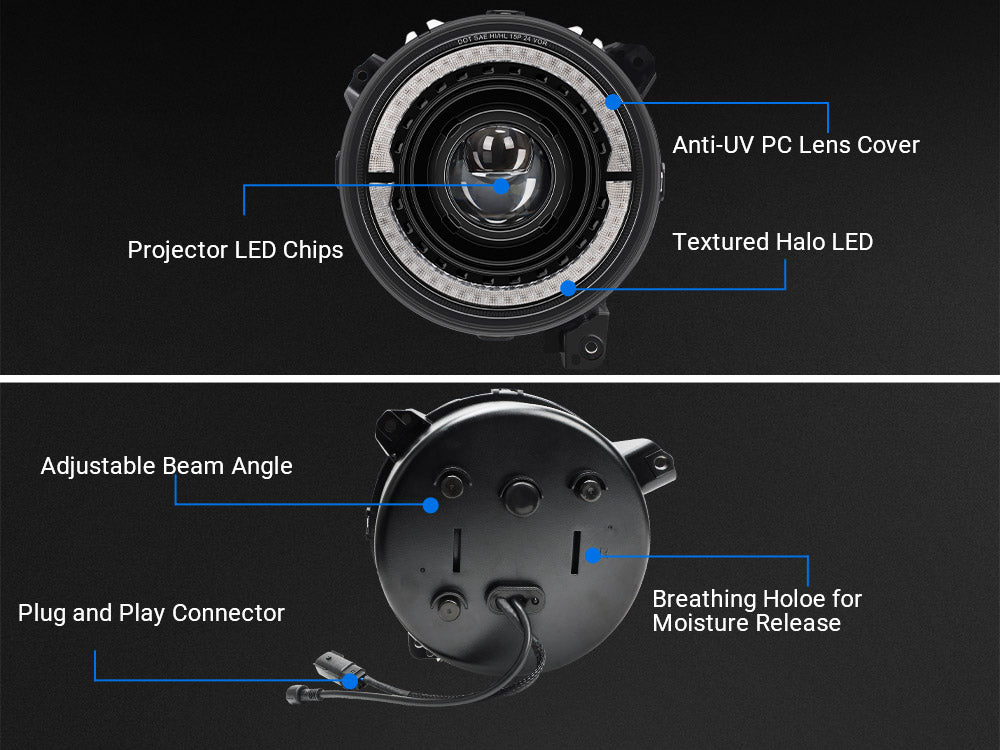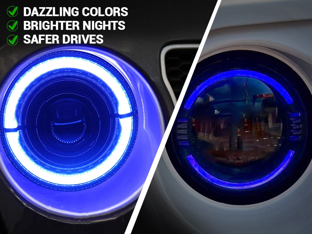 Los faros delanteros halo RGB Jeep JL reemplazan la bombilla halógena original y los LED del proyector HID, un 500 % más brillantes que los de fábrica y le dan a su automóvil una nueva apariencia, aprobados por el DOT, legales para conducir en la carretera.