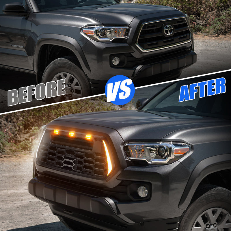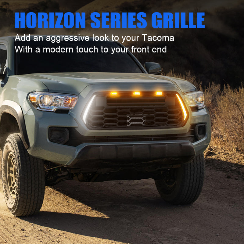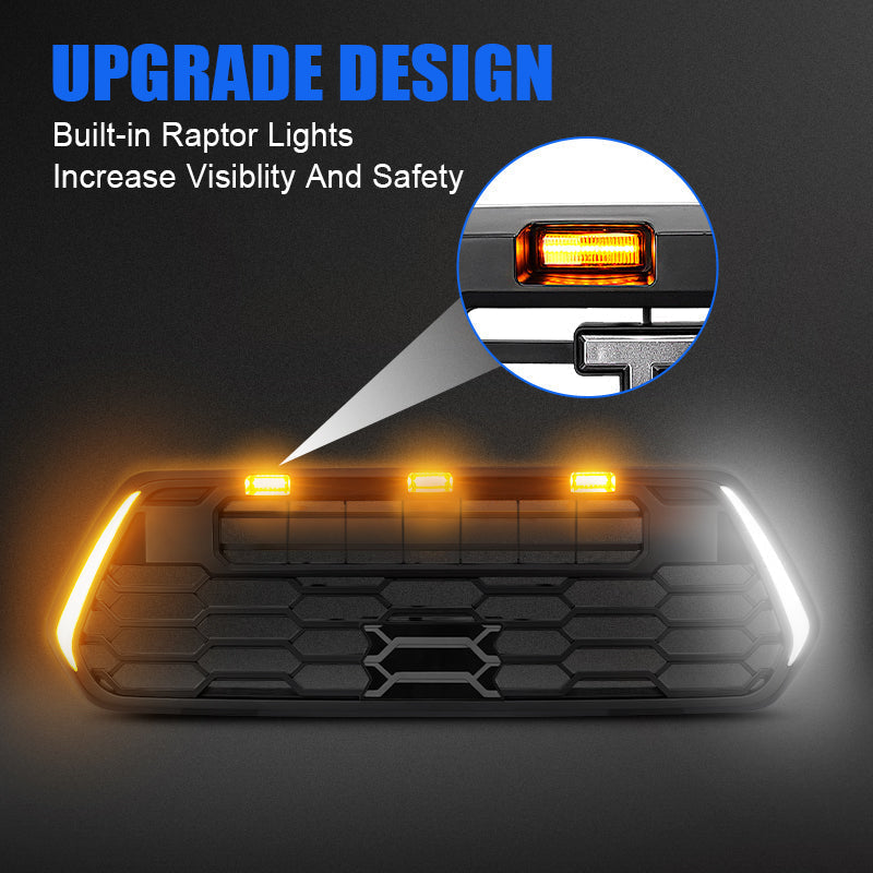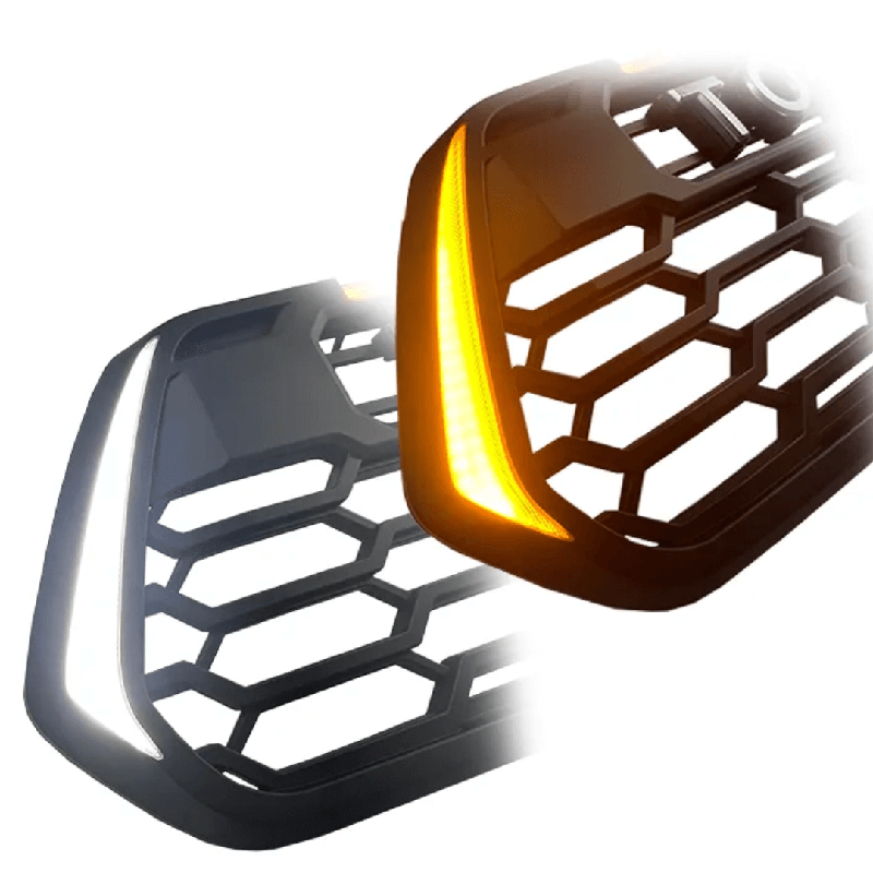 This TRD Pro style grille features three bright amber LED lights that make a bold statement. It offers a rugged and aggressive look, and its light intensity surpasses traditional Raptor lights. Whether day or night, this grille enhances your Tacoma’s appearance with a modern and powerful edge.
