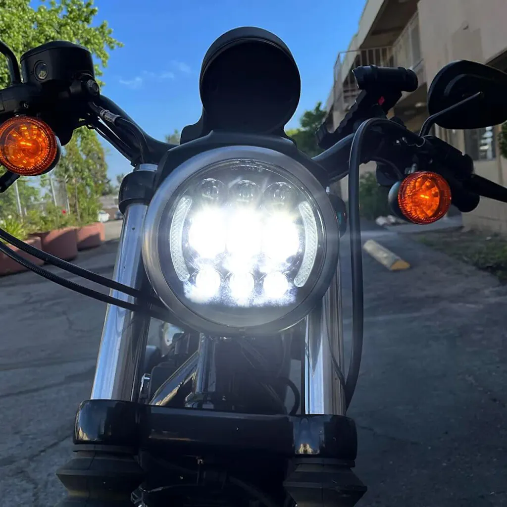 DOT on the upper surface of this 5.75 inch motorcycle headlight and fog lights, which let your lights are Compliant with the United States Department of Transportation for use in the U.S. & Canada to secure the safety of others. Super Bright All-sealed 5.75” Motorcycle Led Headlight: high beam,low beam ,DRL,turn left,turn right. This 5.75 inches motorcycle headlight is 300% brighter than the halogen headlights. All-sealed design makes this headlight anti-dust and waterproof.