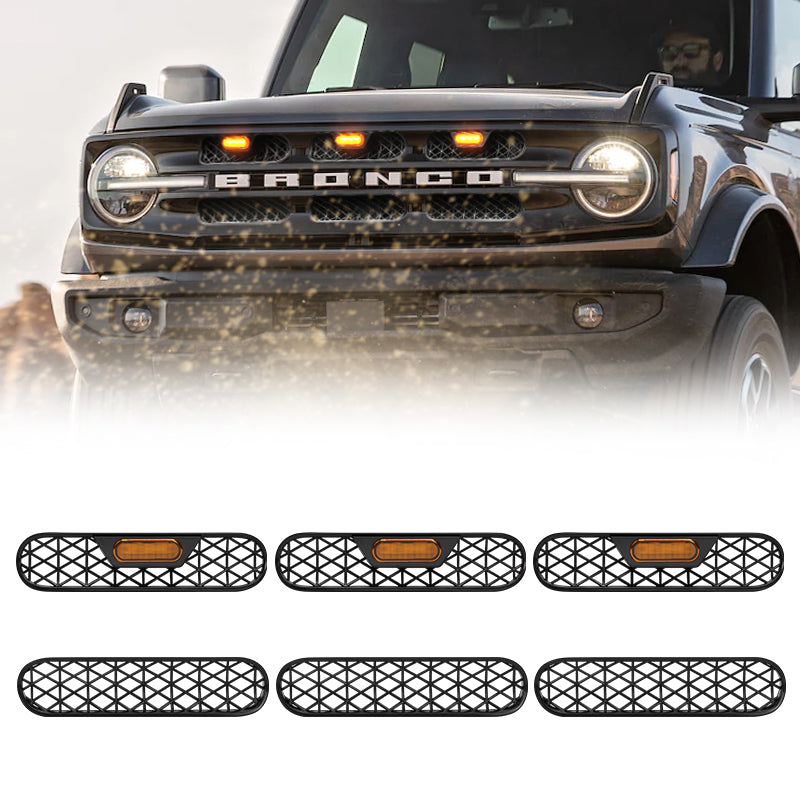 6Pcs Front Mesh Grille Insert with LED Lights for Bronco Big Bend and Outer Banks