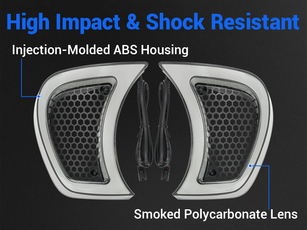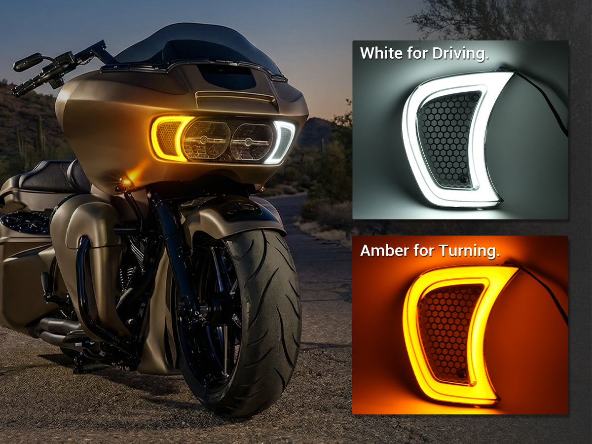 Upgrade your Harley Road Glide with LED Factory Mart Vent Lights—designed to boost both style and brightness. Featuring powerful LED daytime running lights and integrated turn signals, they deliver eye-catching visibility from every angle, enhancing your presence and safety on the road.