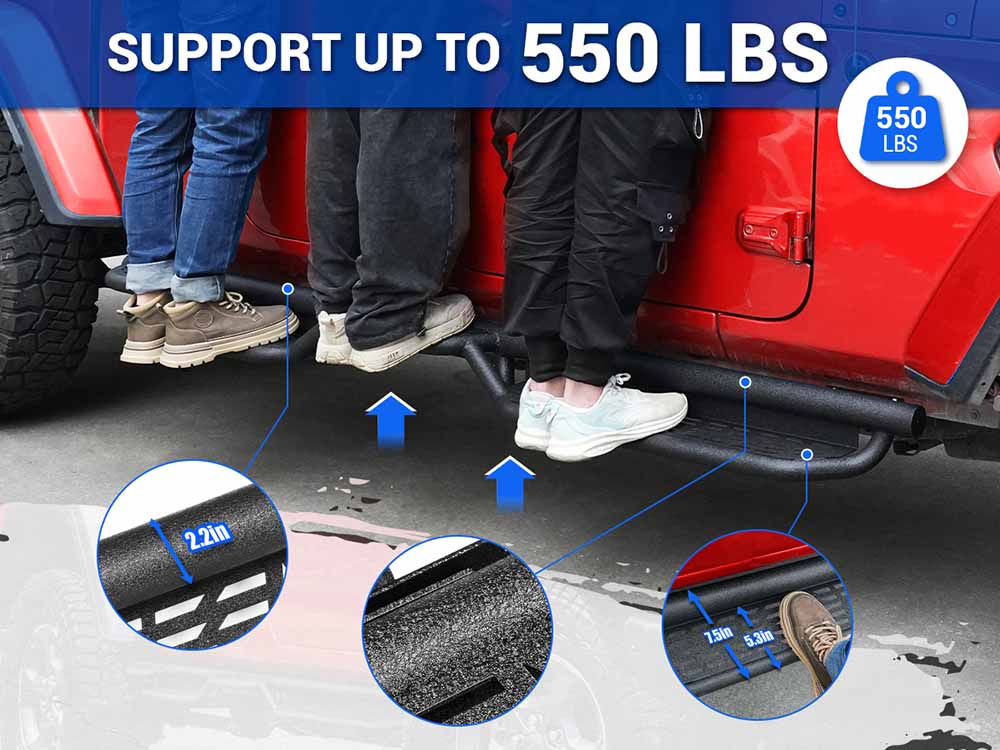 These steps exceeded my expectations. They look fantastic on my Gladiator. The tubular design and textured finish are both stylish and functional. The welds are solid, and they really help my mobility-impaired wife get into the truck. They also look great against the gray lower doors. While theres a lot of hardware involved, the installation wasnt too difficult.