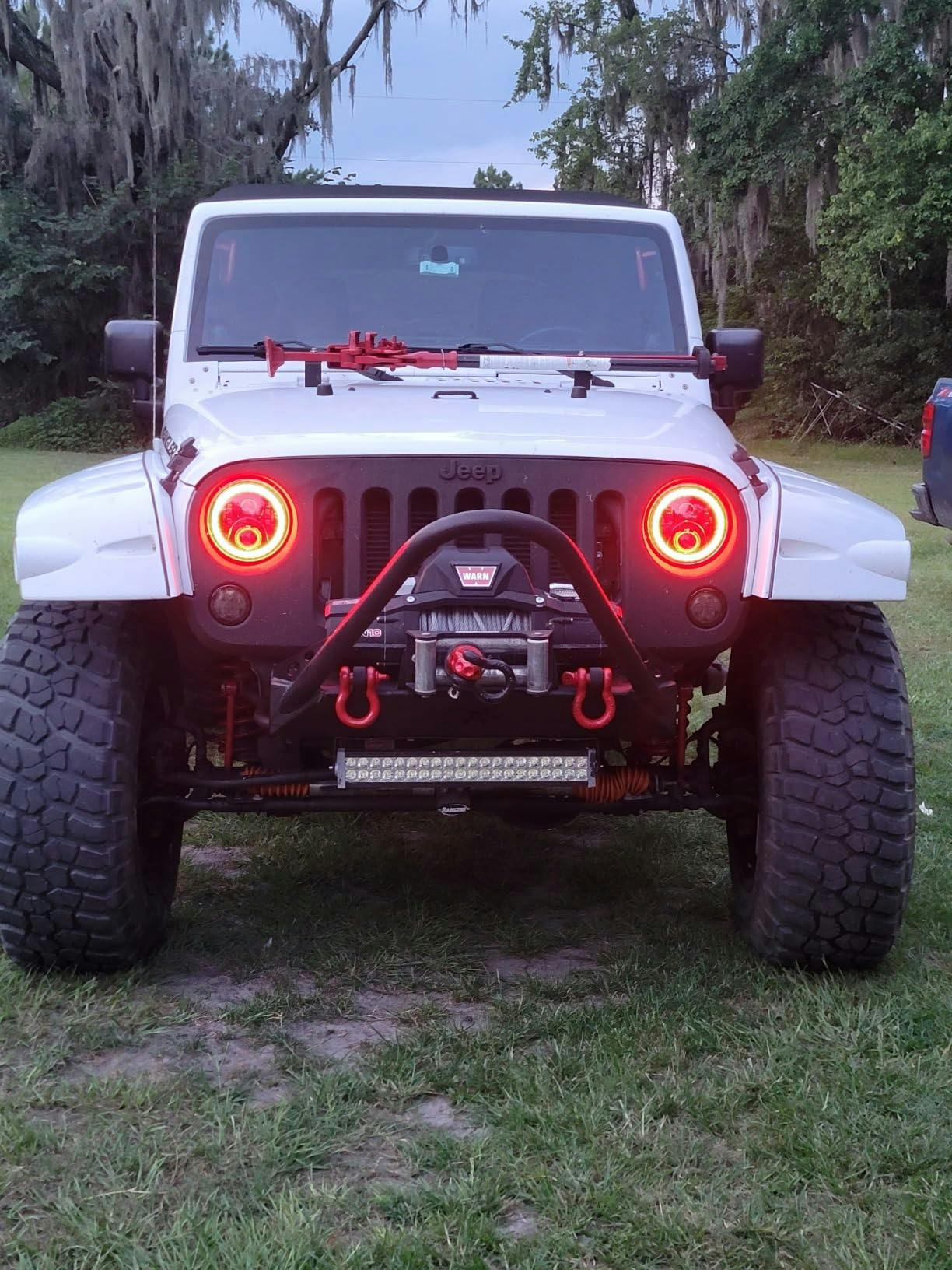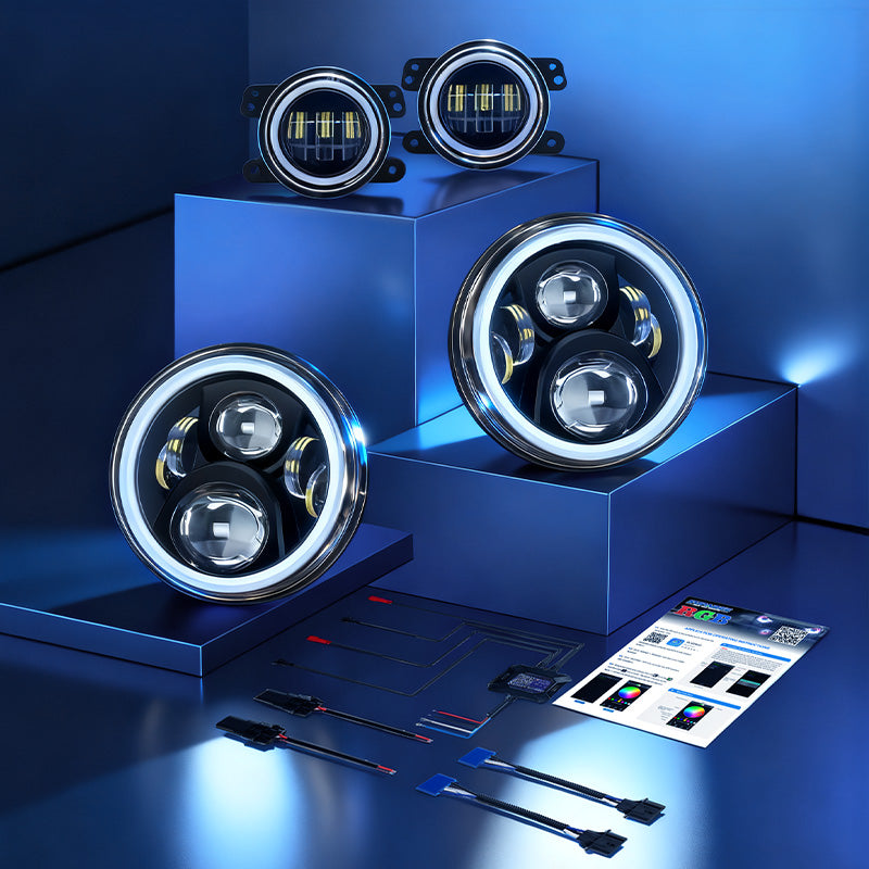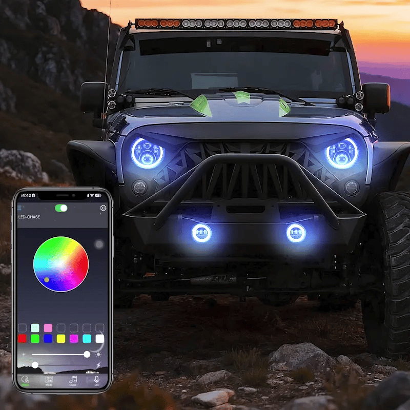 2007-2018 Jeep JK Headlights Upgrade LED RGB Halo + Amber Turn Signal & Fog Lights