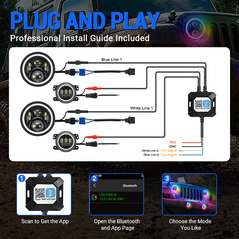 Take your Halo game to the next level with our Bluetooth-controlled RGB Headlight & Fog Light Combo. Controlled together from the same control box. DIY 16 million colors, 155 dynamic modes, iOS and Android compatible, adjustable brightness, music mode, pattern modification, flashing function, timing function, automatic control, and EMC inside. Plug and play. Featuring super bright LED projector beams to illuminate your path—you can’t go wrong.
