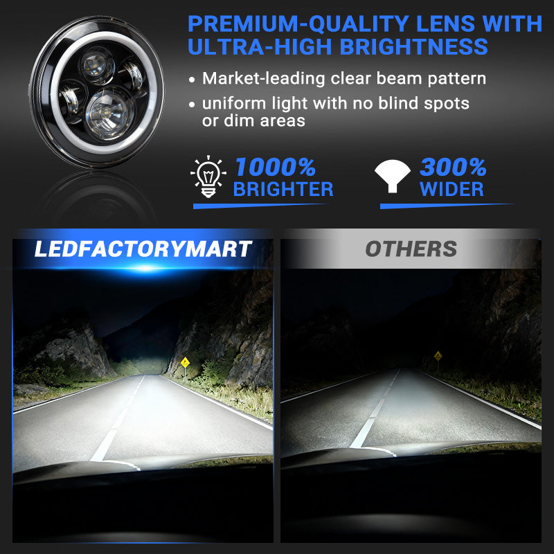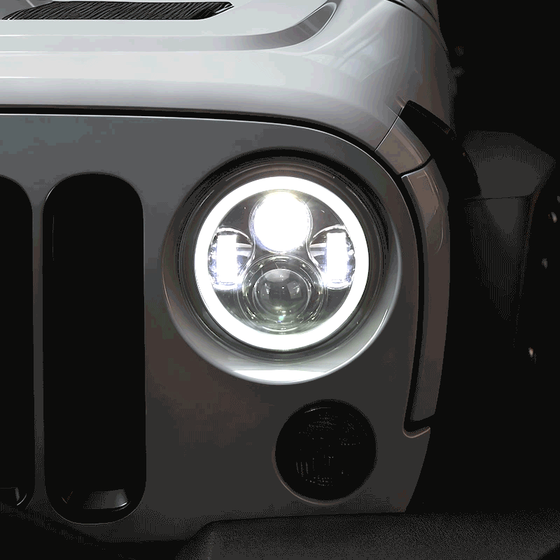 The Jeep LED halo headlight has a futuristic sleek black bezel coupled with an advanced optical cut-off line with the newest LED technology to give you a top-notch beam pattern as well as an increased light output. This design greatly improves visibility to make driving much safer on the road, all the while giving your car a unique appearance.