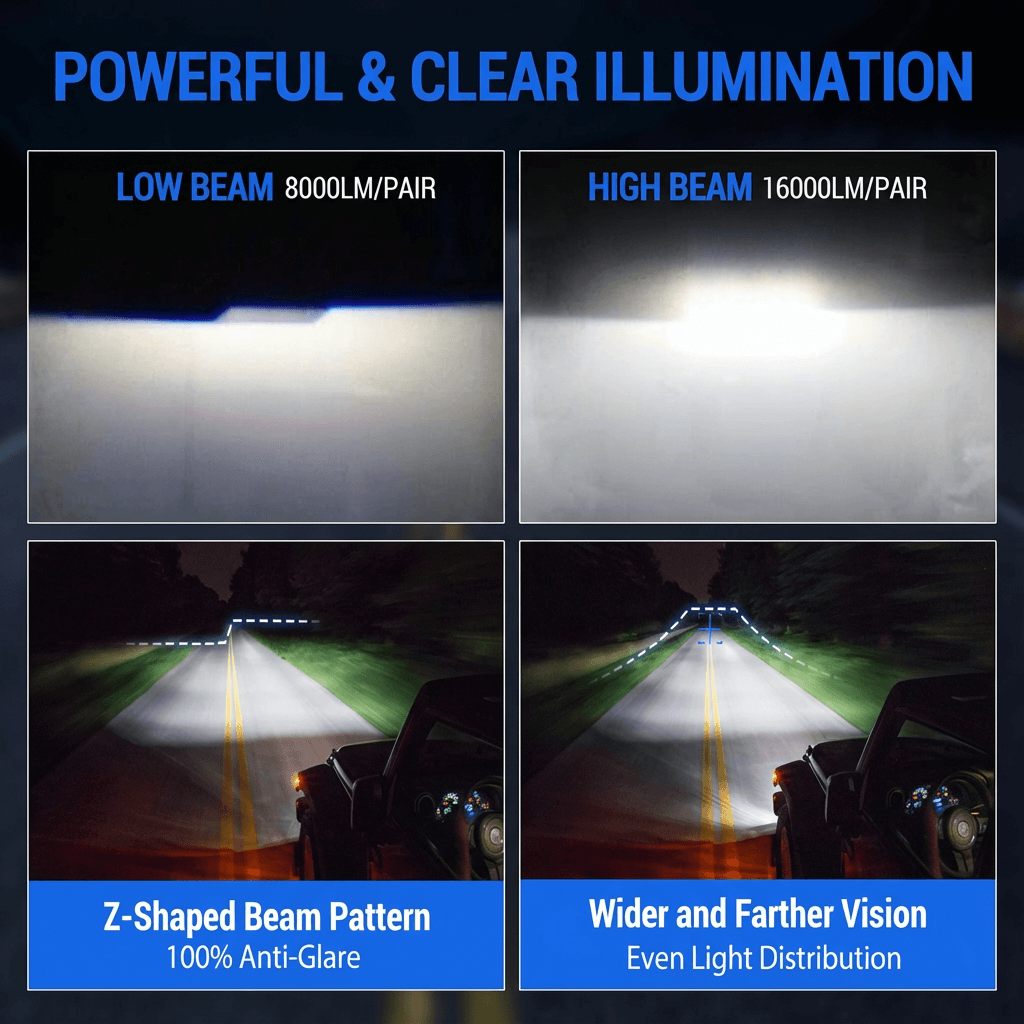 A: The improvement is massive. With 12,000LM for high beams and 6,000LM for low beams, these are over 3 times brighter than stock halogens. The 6000K white light combined with advanced optics provides a significantly wider and longer field of vision.