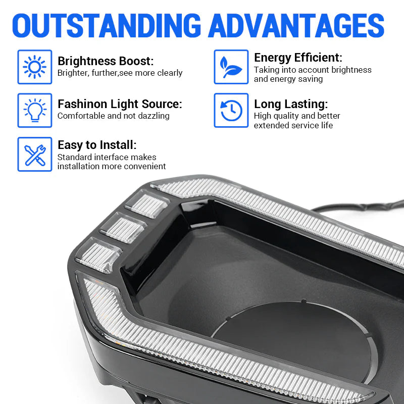 The light boasts a durable ABS housing, PC lens, and rear radiator for heat dissipation. IP68 waterproof and impact-resistant, it ensures reliable all-weather performance for 2016-2023 models.