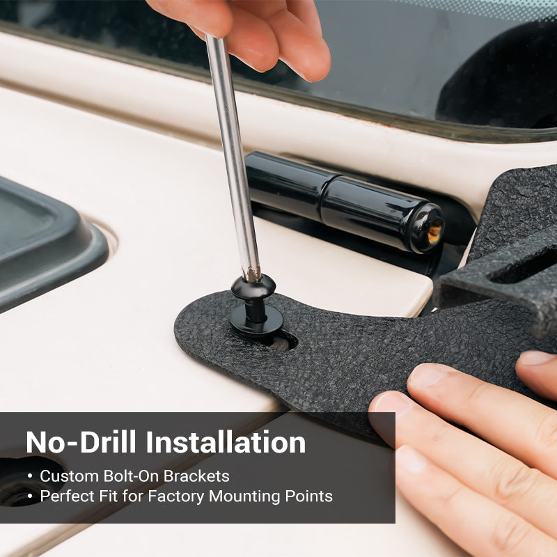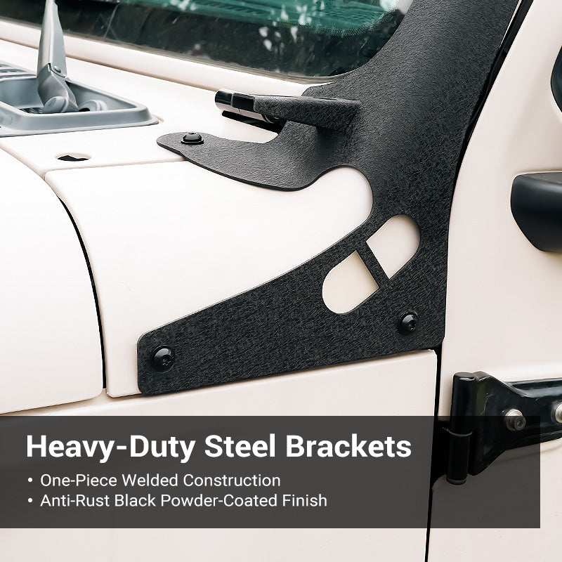 Custom bolt-on brackets perfectly align with factory mounting points for a secure, no-drill installation on Jeep Wrangler A-pillar sides.