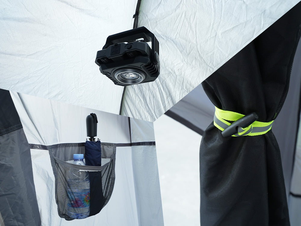 The SUV tent has 2 doors and 1 window to ensure air circulation, prevent stuffiness and make it easier to get in and out of the tent. There are 2 mesh pockets inside the tent with convenient interior space for collecting debris.
