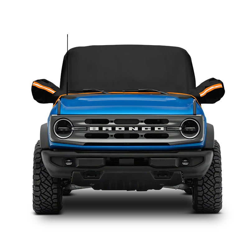 Thank you for your support and feedback on our Bronco car cover, The mirror part of the cover is customized 1:1 according to the factory mirror size of the Bronco, which protects the front mirror better. Also, we recommend hanging the hook on the bottom of the Bronco to make the car cover more firmly.